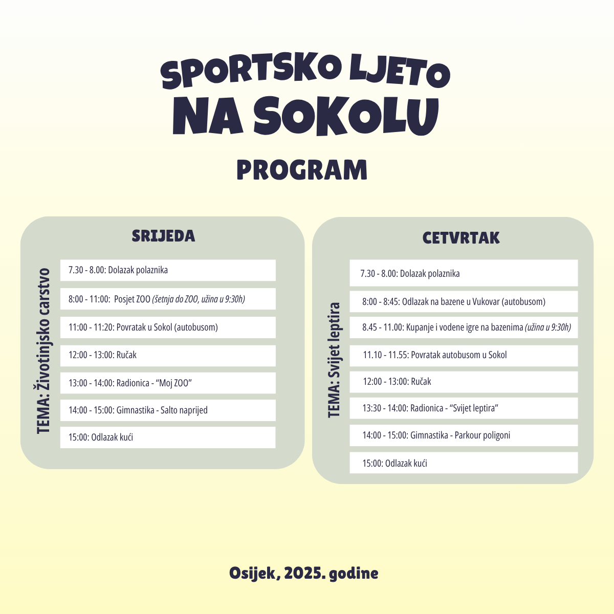 Sportsko ljeto na Sokolu ljetni je kamp namijenjen djeci od 5 do 12 godina, a provodi se kroz petodnevni boravak u vrhunskom sportsko – rekreacijskom objektu Sokol Centar Osijek (Kralja Zvonimira 5 u Osijeku).